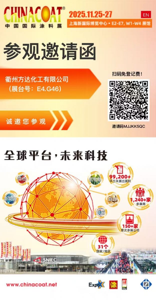 当“碳达峰、碳中和”成为全球涂料行业的共同命题,一场关于绿色原料的“革命”正在悄然发生——衢州方达化工有限公司率先交出高分答卷!2025年11月25-27日,上海新国际博览中心(SNIEC),方达化工将携“专注新材料领域,用绿色原料编织低碳未来”的硬核实力,震撼亮相中国国际涂料展(CHINACOAT 2025)E4.G46展台。